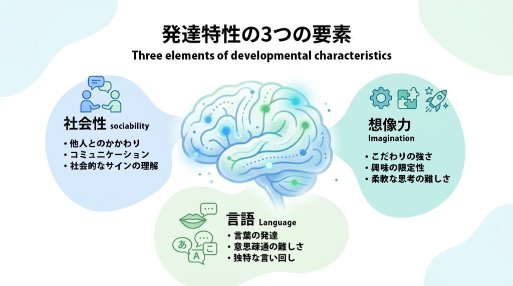 アスペルガー症候群の特性は、主に「社会性」「言語理解」「想像力」の3つの領域に関係すると考えられています。